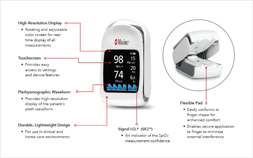 Optimisé par la technologie cliniquement prouvée Masimo Signal Extraction Technology® (SET®) et équipé d’une fonction de pléthysmographie (RRp®), MightySat Rx amène l’oxymétrie de pouls ponctuelle à portée de doigt, avec une utilisation aisée et sans fil.