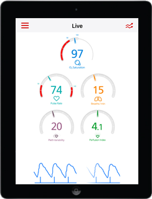 Avec le modèle équipé de la fonction Bluetooth® LE, vous pouvez voir et partager les données des paramètres, y compris les tendances et la courbe de pléthysmographie, via l’application Masimo SafetyNet®† à installer sur un appareil intelligent compatible.